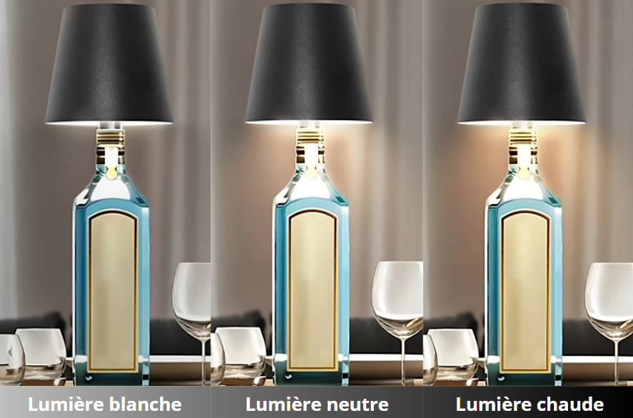 Notre lampe bouteille allie style et fonctionnalité. Elle dispose de 3 teintes de lumière (blanche, neutre et chaude) avec une intensité réglable en continu. Parfaite pour créer l'atmosphère idéale dans chaque pièce.